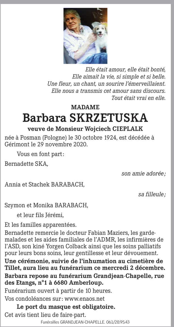 Décédée à Gérimont (6680) le dimanche 29 novembre 2020 à l'âge de 96 ans