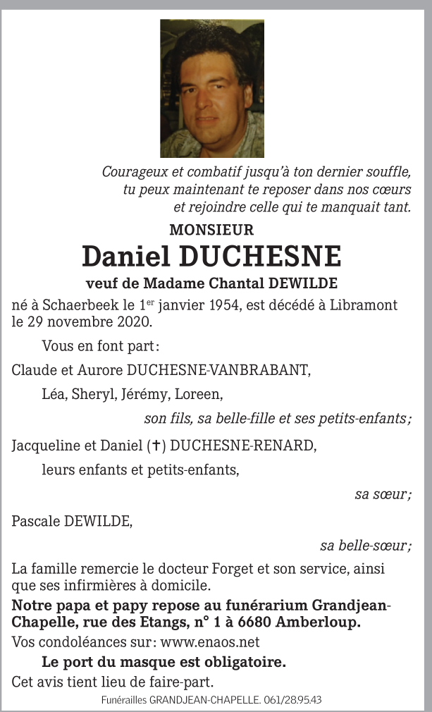 Décédé à Libramont (6800) le dimanche 29 novembre 2020 à l'âge de 66 ans