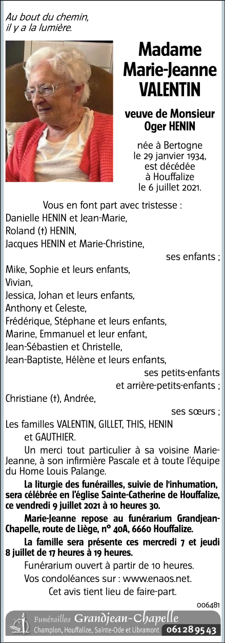 Décédée à Houffalize (6660) le mardi 6 juillet 2021 à l'âge de 87 ans