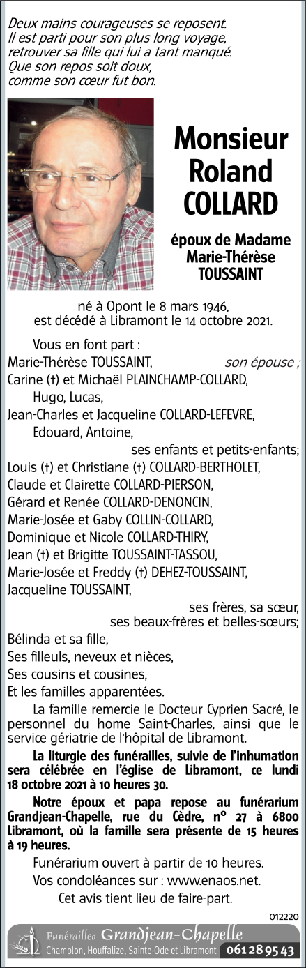 Décédé à Libramont (6800) le jeudi 14 octobre 2021 à l'âge de 75 ans