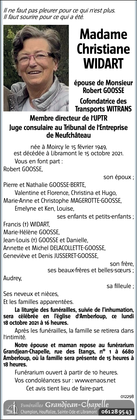 Décédée à Libramont (6800) le vendredi 15 octobre 2021 à l'âge de 72 ans