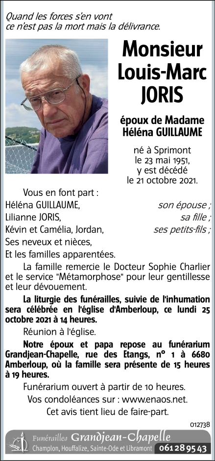 Décédé à Sprimont (6680) le jeudi 21 octobre 2021 à l'âge de 70 ans