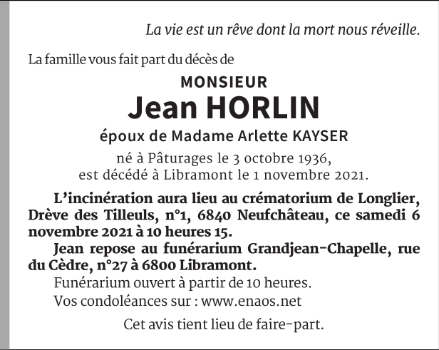Décédé à Libramont (6800) le lundi 1 novembre 2021 à l'âge de 85 ans