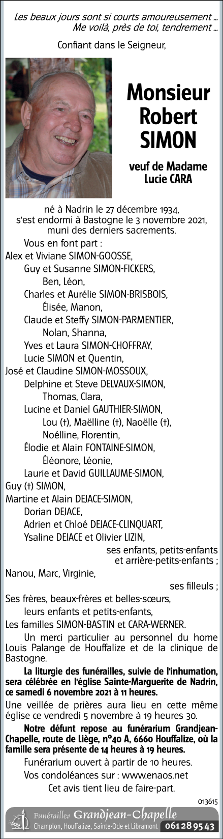 Décédé à Bastogne (6600) le mercredi 3 novembre 2021 à l'âge de 86 ans