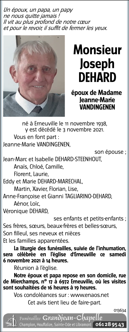 Décédé à Erneuville (6972) le mercredi 3 novembre 2021 à l'âge de 82 ans