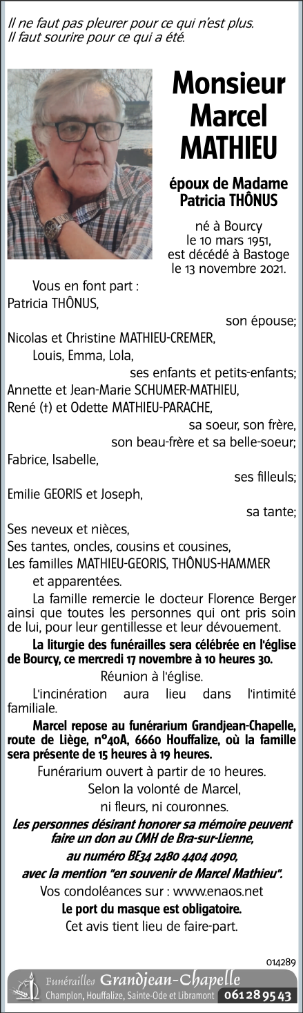 Décédé à Bastogne (6600) le samedi 13 novembre 2021 à l'âge de 70 ans