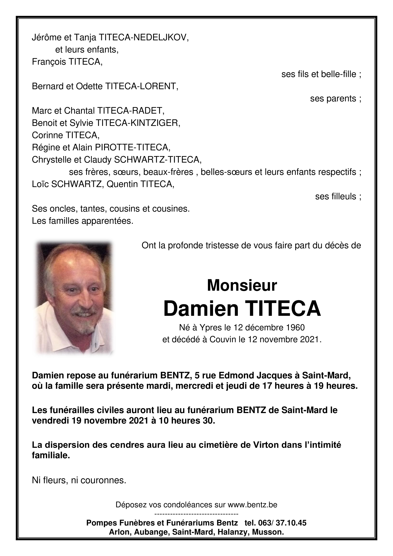 Décédé à Couvin (5660) le vendredi 12 novembre 2021 à l'âge de 60 ans
