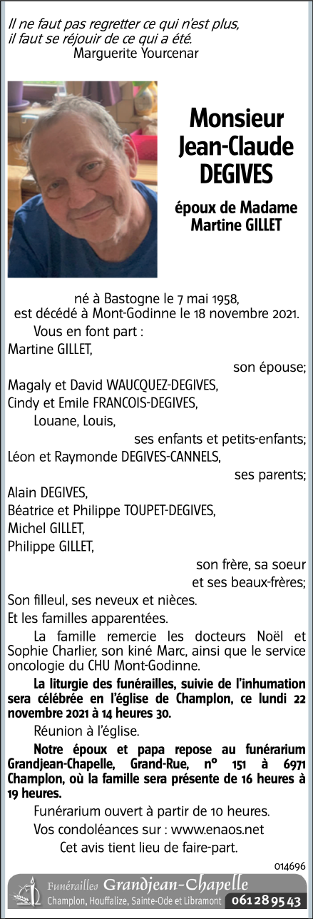 Décédé à Mont-Godinne (5530) le jeudi 18 novembre 2021 à l'âge de 63 ans