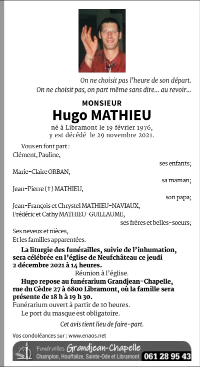 Décédé à Libramont (6800) le lundi 29 novembre 2021 à l'âge de 45 ans