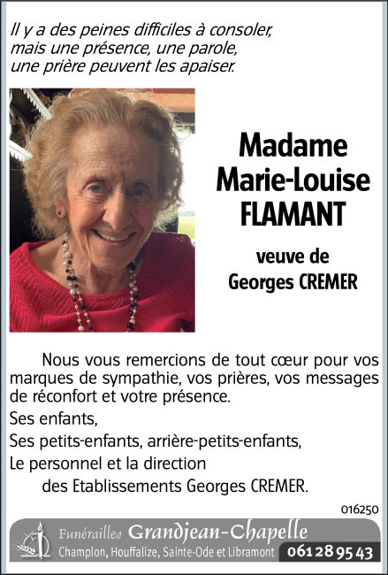 Décédée à Libramont (6800) le samedi 20 novembre 2021 à l'âge de 89 ans