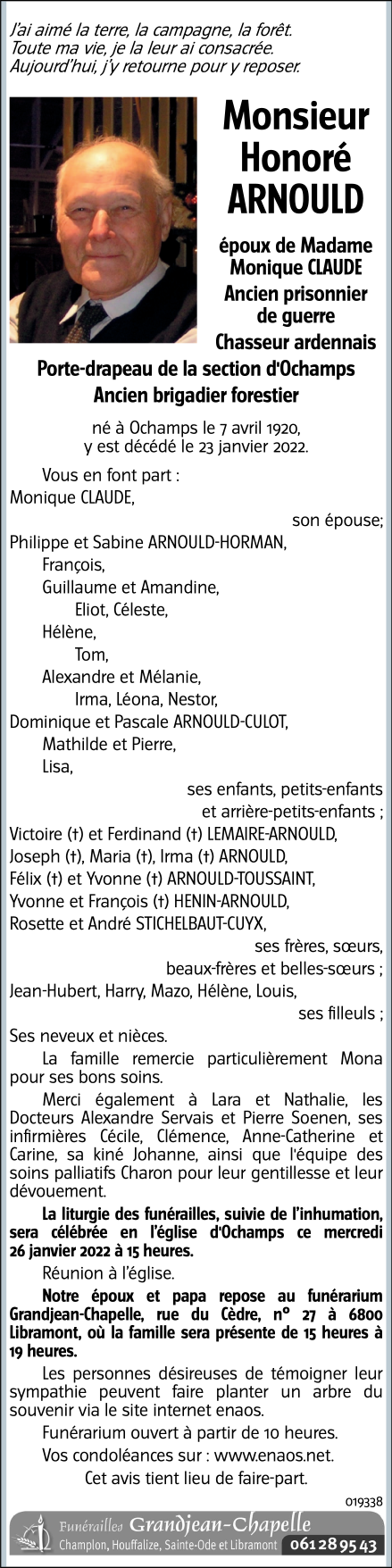 Décédé à Ochamps (6890) le dimanche 23 janvier 2022 à l'âge de 101 ans