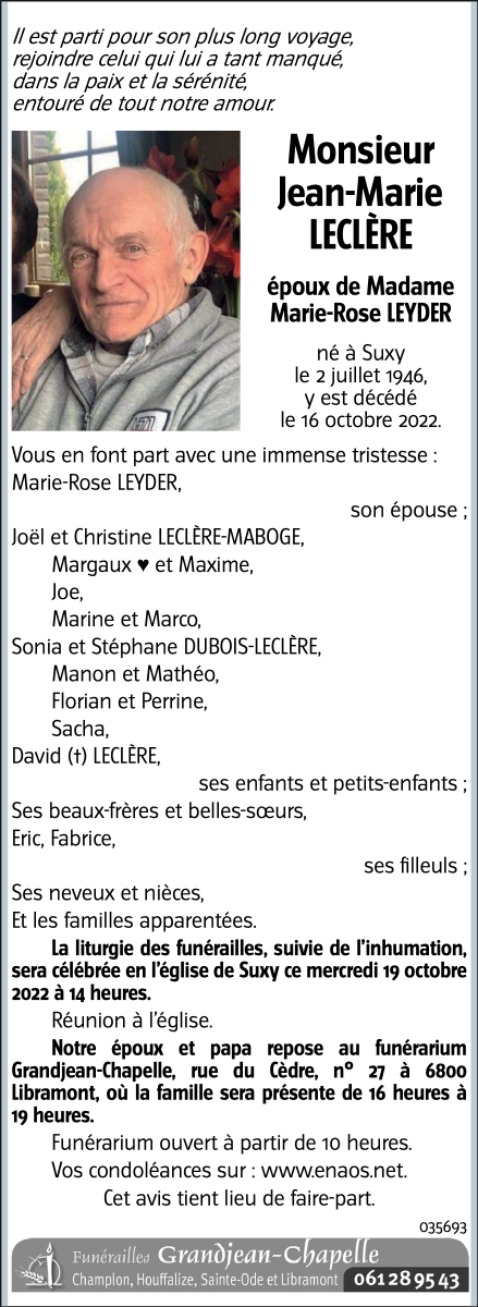 Décédé à Suxy (6812) le dimanche 16 octobre 2022 à l'âge de 76 ans