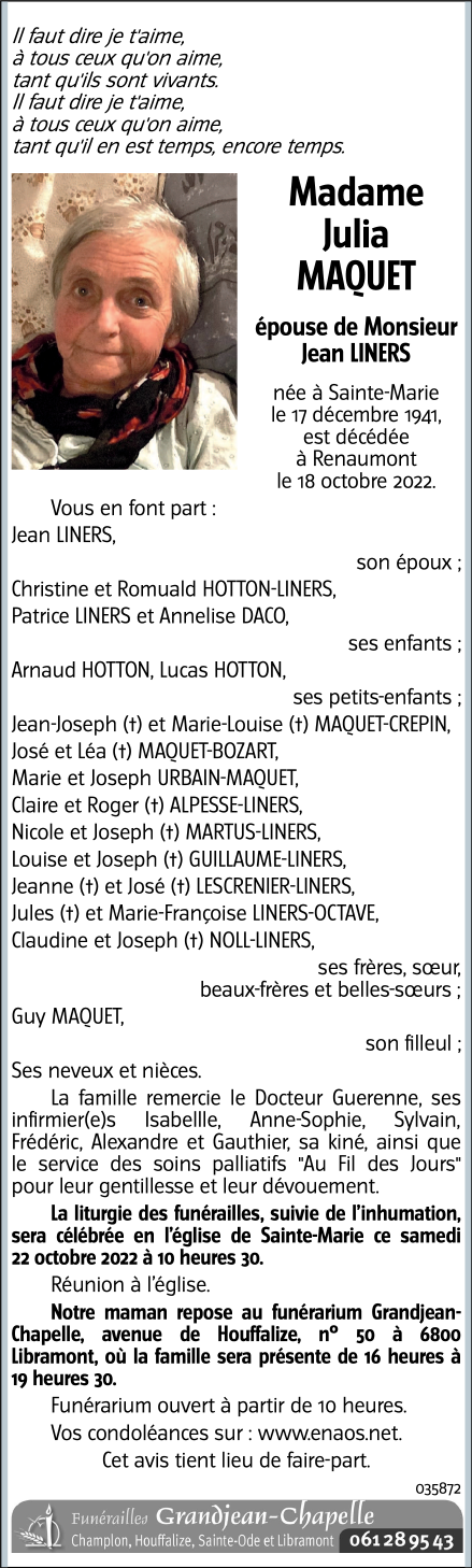 Décédée à Renaumont (6800) le mardi 18 octobre 2022 à l'âge de 80 ans