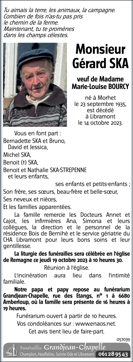 Décédé à Libramont (6800) le samedi 14 octobre 2023 à l'âge de 88 ans