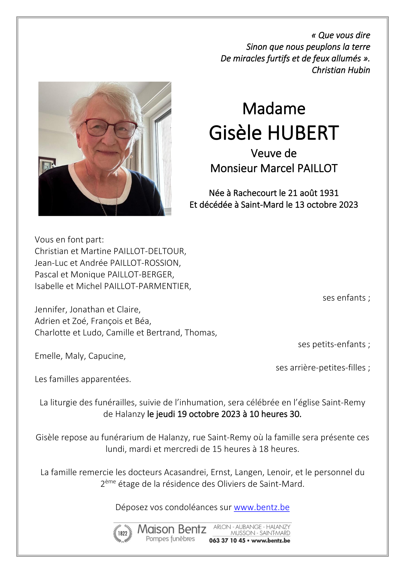 Décédée à Saint-Mard (6762) le vendredi 13 octobre 2023 à l'âge de 92 ans