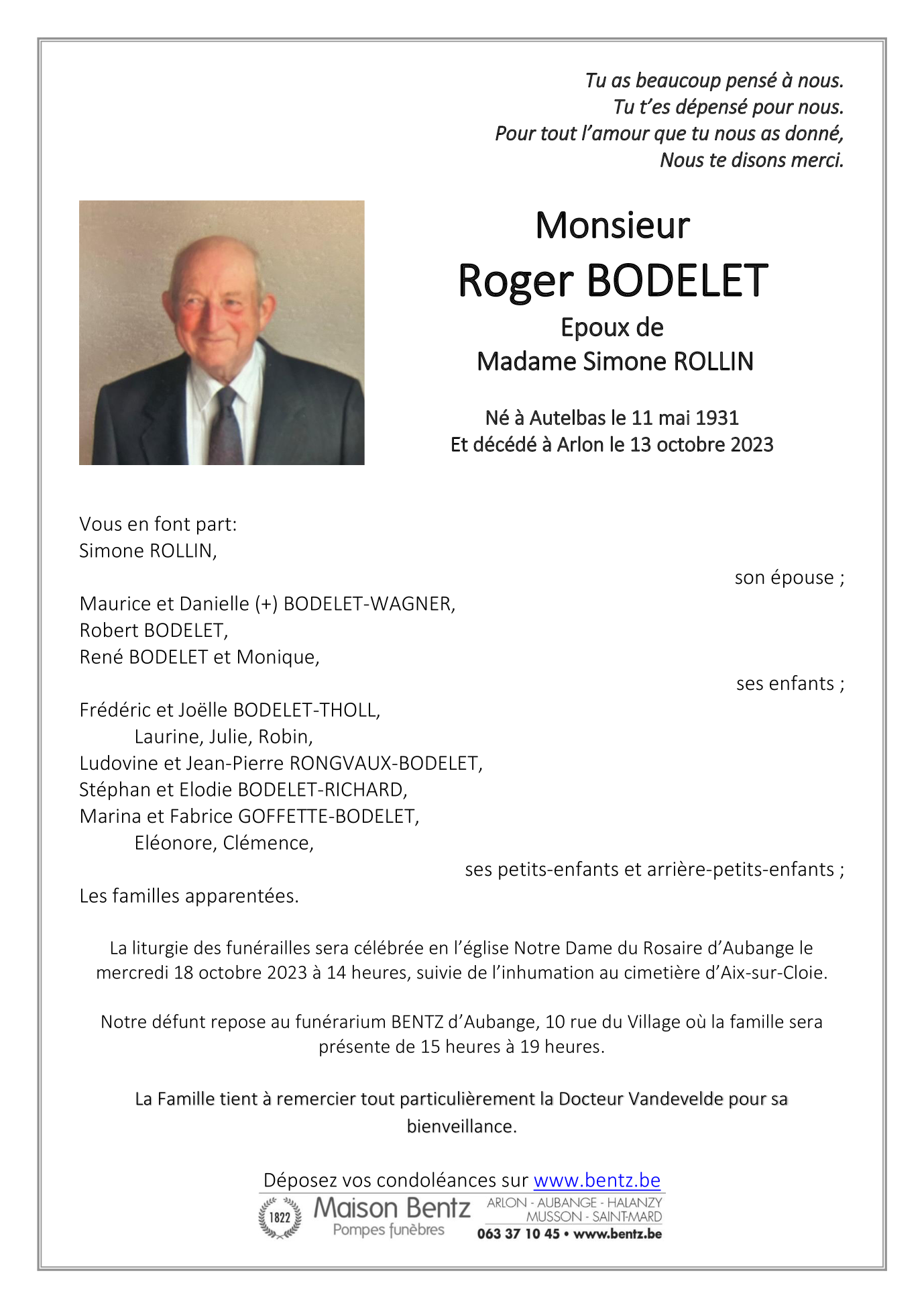 Décédé à Arlon (6700) le vendredi 13 octobre 2023 à l'âge de 92 ans