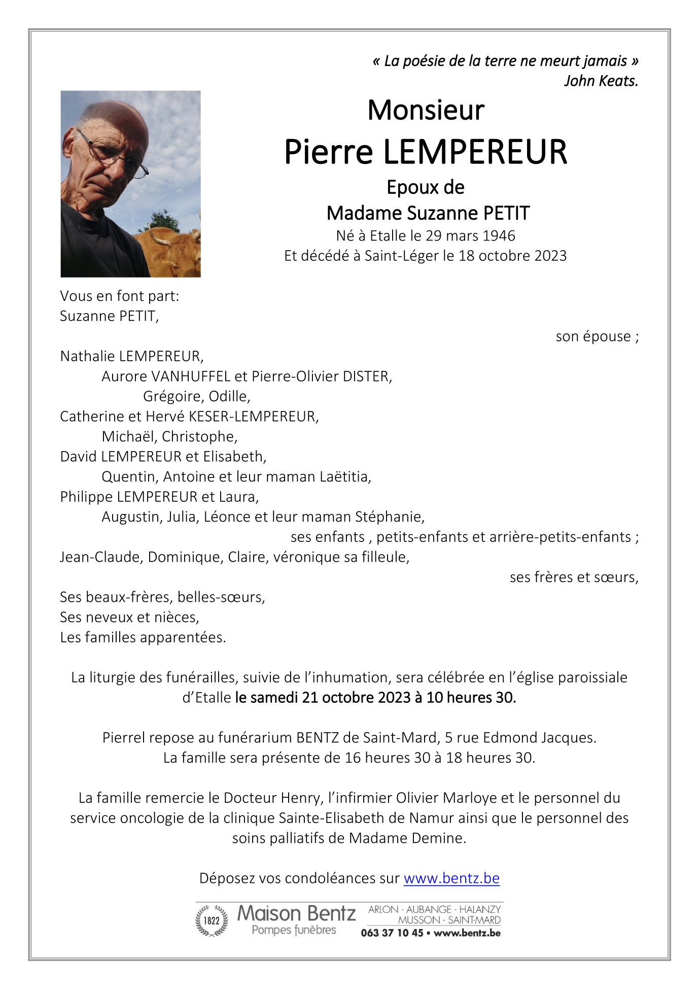 Décédé à Saint-Léger (Lux.) (6747) le mercredi 18 octobre 2023 à l'âge de 77 ans