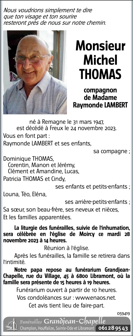 Décédé à Freux (6800) le vendredi 24 novembre 2023 à l'âge de 76 ans