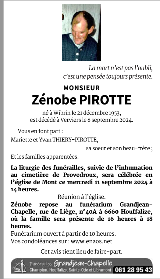 Décédé à Verviers (4800) le dimanche 8 septembre 2024 à l'âge de 70 ans