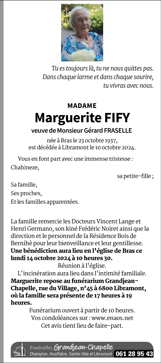 Décédée à Libramont (6800) le jeudi 10 octobre 2024 à l'âge de 86 ans