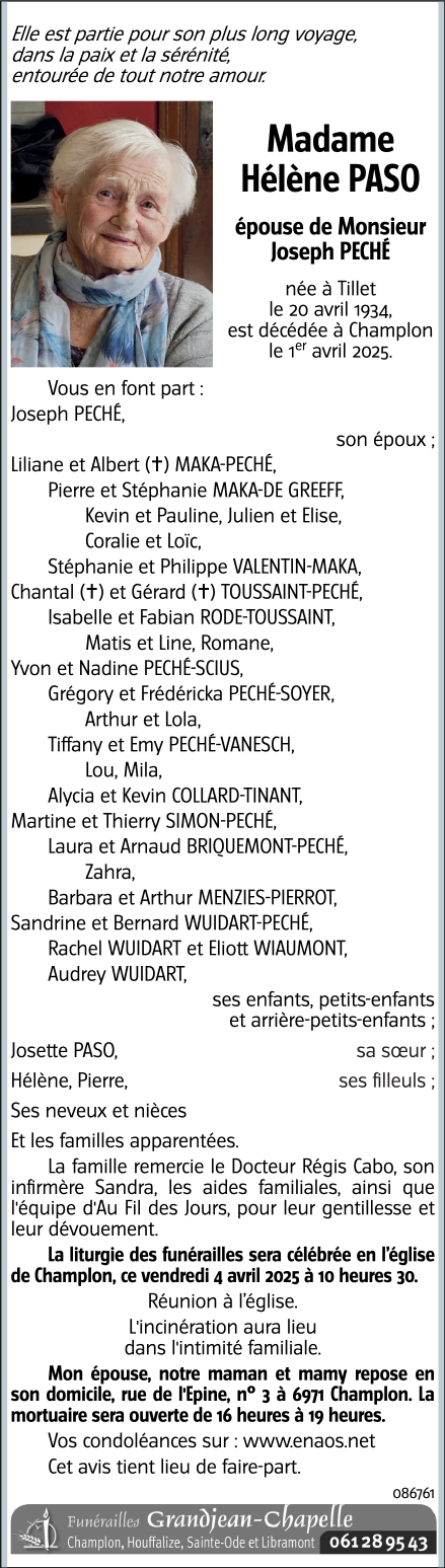 Décédée à Champlon (6971) le mardi 1 avril 2025 à l'âge de 90 ans