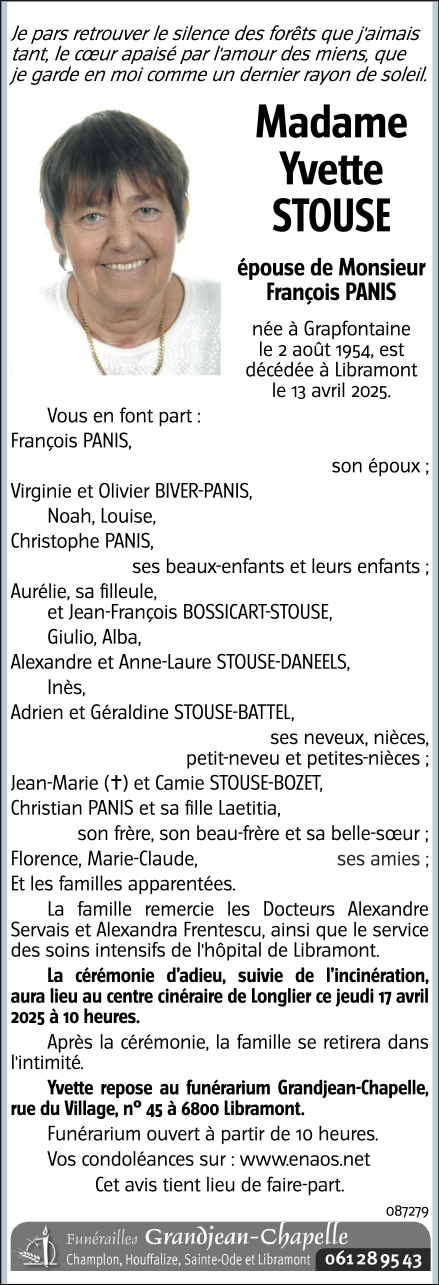 Décédée à Libramont (6800) le dimanche 13 avril 2025 à l'âge de 70 ans
