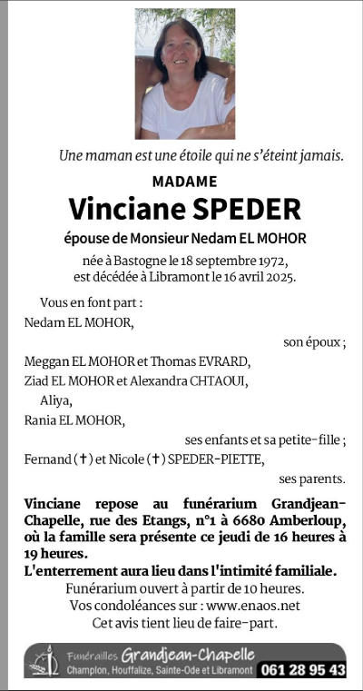 Décédée à Libramont (6800) le mercredi 16 avril 2025 à l'âge de 52 ans