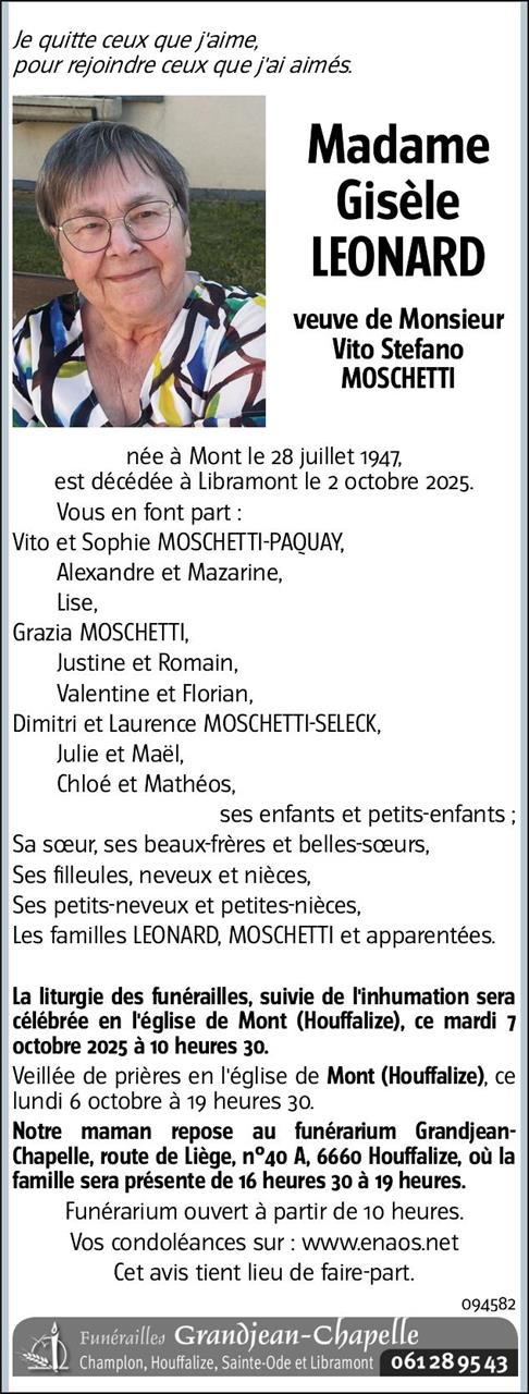 Décédée à Libramont (6800) le jeudi 2 octobre 2025 à l'âge de 78 ans