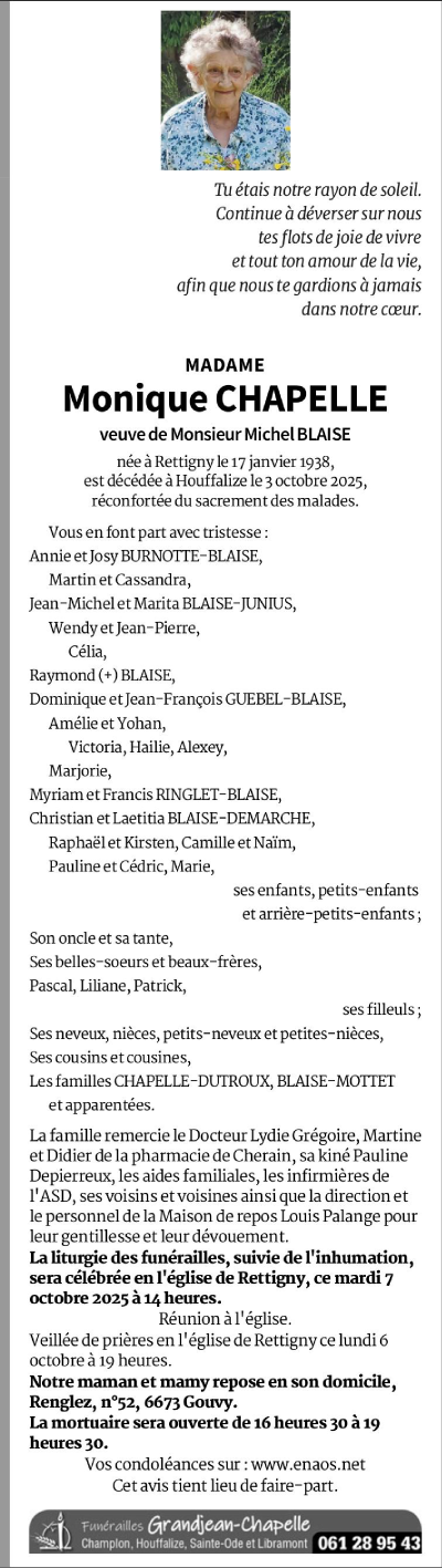 Décédée à Houffalize (6660) le vendredi 3 octobre 2025 à l'âge de 87 ans