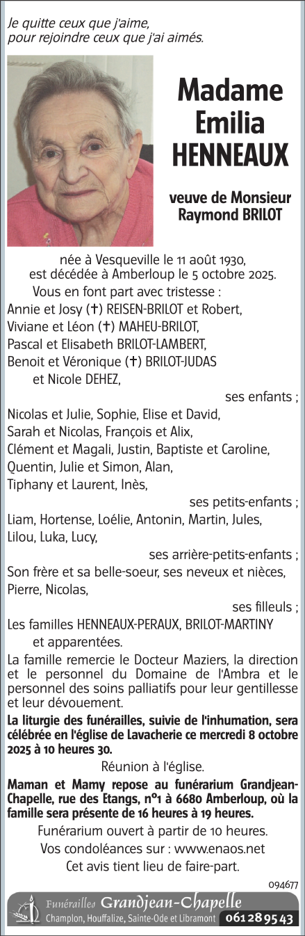 Décédée à Amberloup (6680) le dimanche 5 octobre 2025 à l'âge de 95 ans