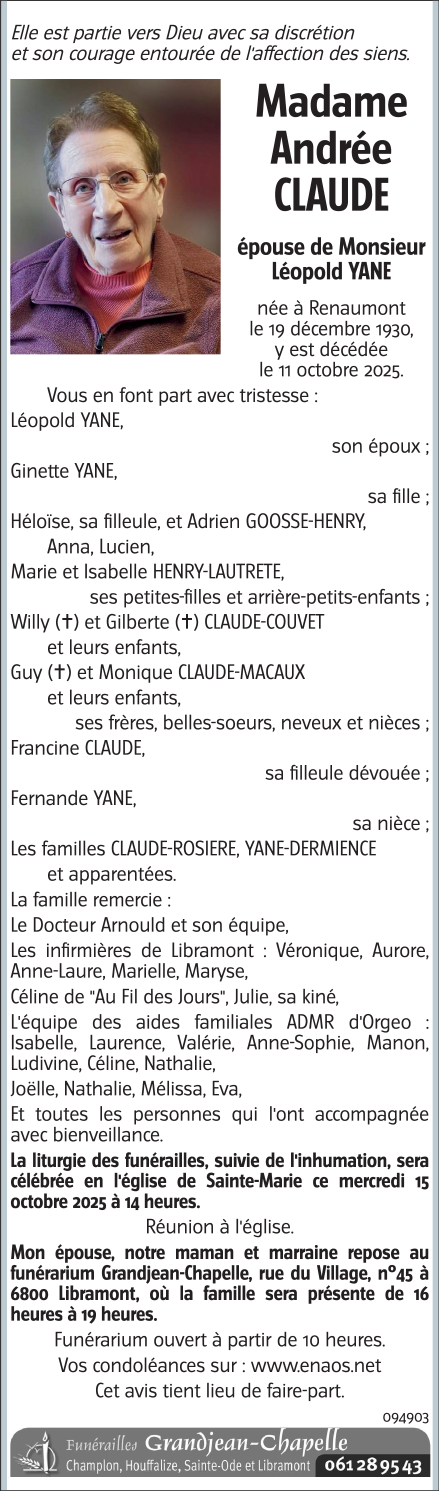Décédée à Renaumont (6800) le samedi 11 octobre 2025 à l'âge de 94 ans