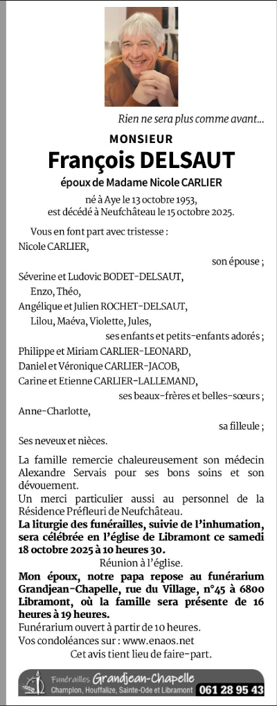 Décédé à Neufchâteau (6840) le mercredi 15 octobre 2025 à l'âge de 72 ans
