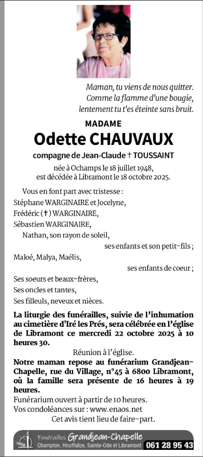Décédée à Libramont (6800) le samedi 18 octobre 2025 à l'âge de 77 ans