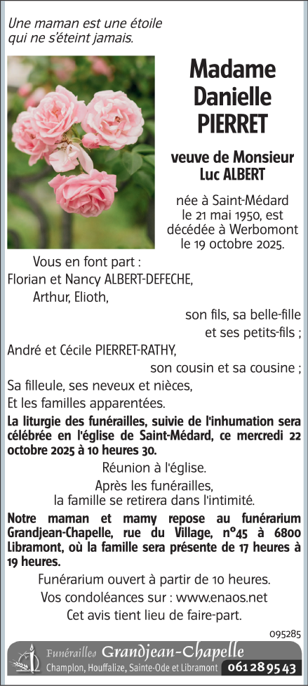 Décédée à Werbomont (4190) le dimanche 19 octobre 2025 à l'âge de 75 ans