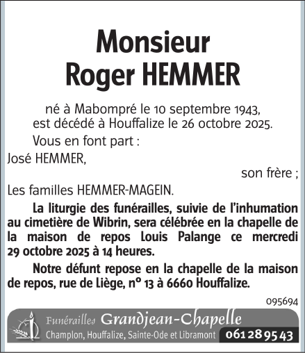 Décédé à Houffalize (6660) le dimanche 26 octobre 2025 à l'âge de 82 ans