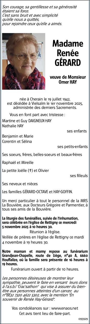 Décédée à Vielsalm (6690) le samedi 1 novembre 2025 à l'âge de 83 ans