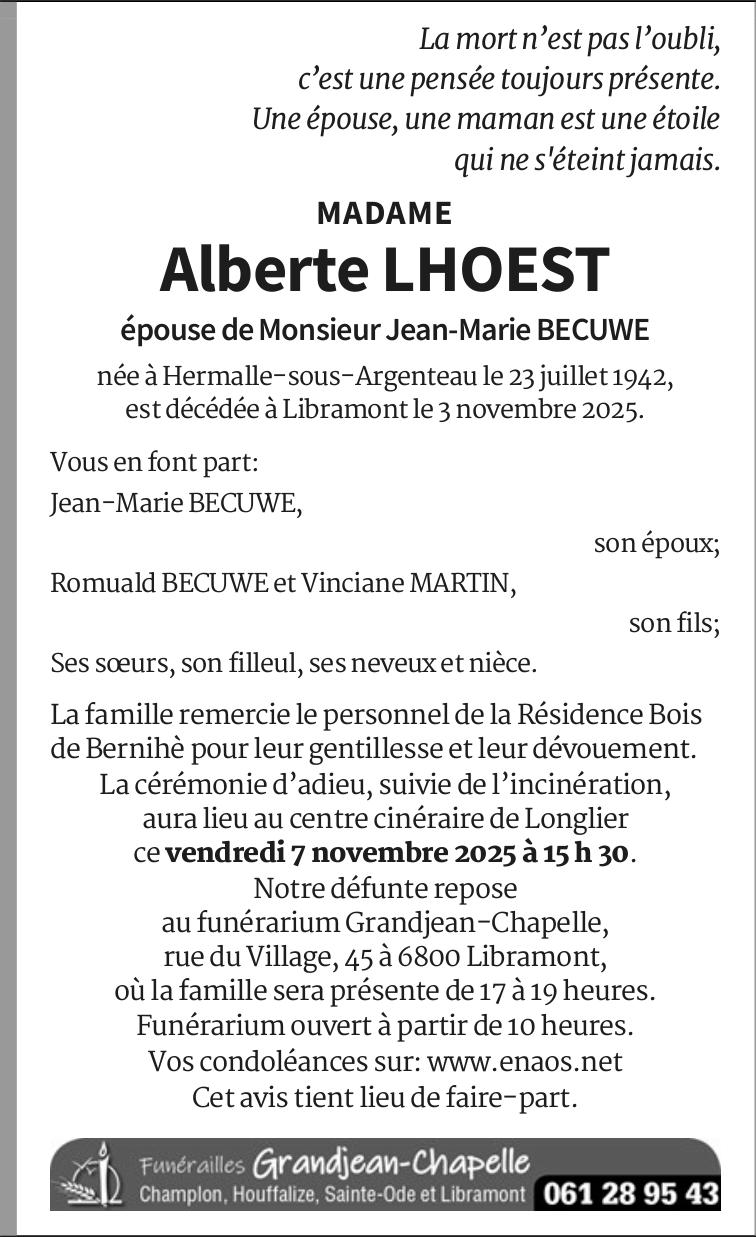 Décédée à Libramont (6800) le lundi 3 novembre 2025 à l'âge de 83 ans