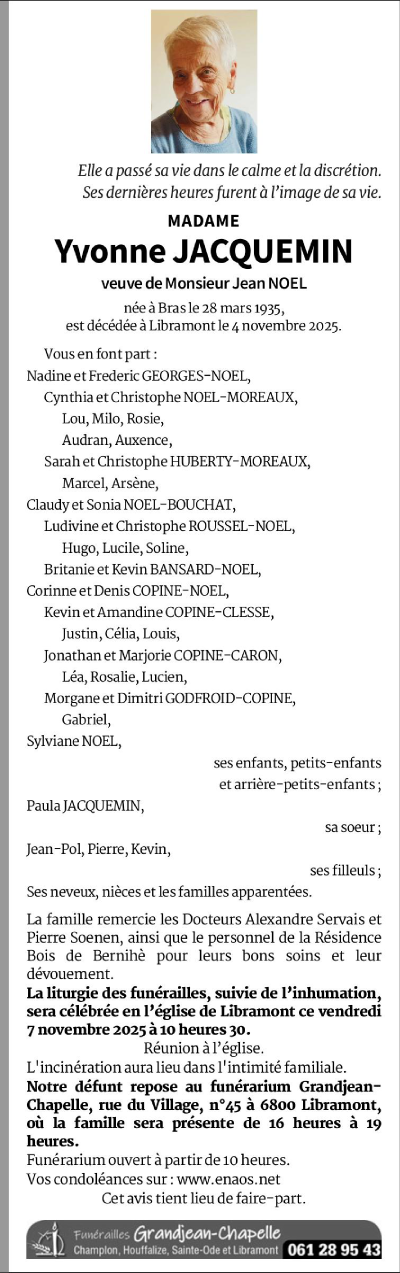 Décédée à Libramont (6800) le mardi 4 novembre 2025 à l'âge de 90 ans