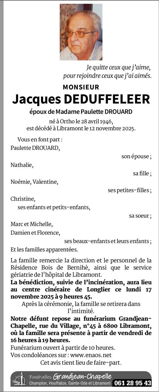 Décédé à Libramont (6800) le mercredi 12 novembre 2025 à l'âge de 79 ans