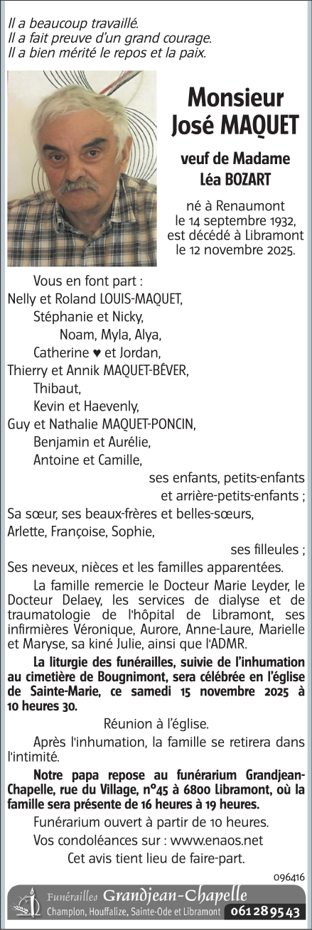 Décédé à Libramont (6800) le mercredi 12 novembre 2025 à l'âge de 93 ans