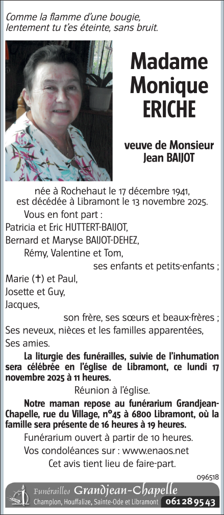 Décédée à Libramont (6800) le jeudi 13 novembre 2025 à l'âge de 83 ans