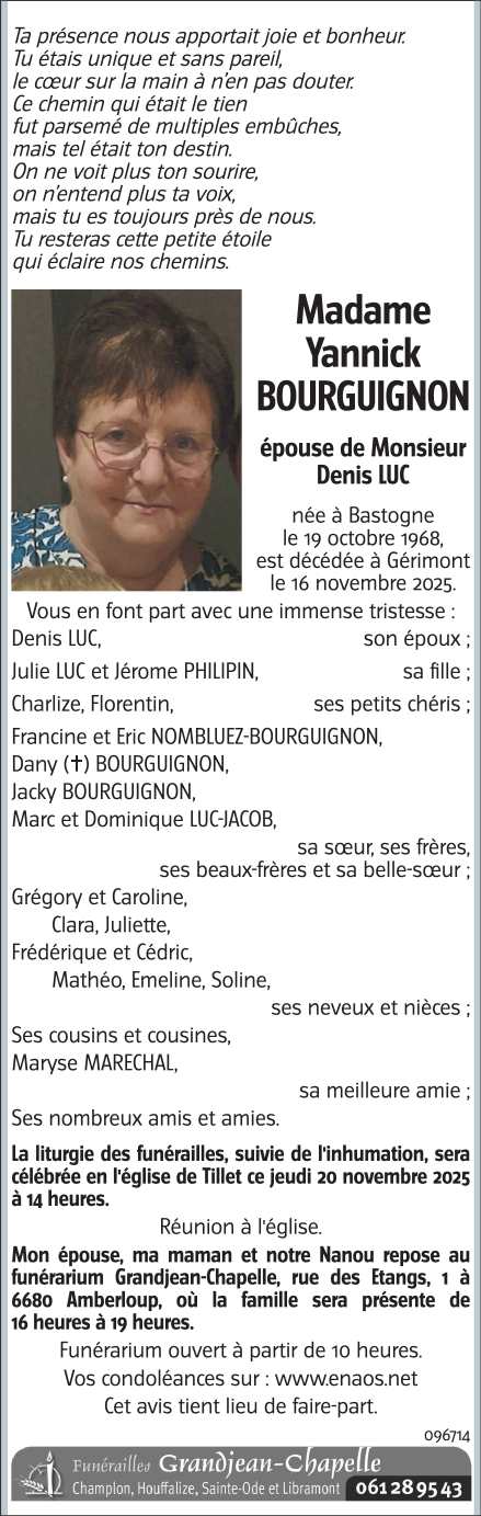 Décédée à Gérimont (6680) le dimanche 16 novembre 2025 à l'âge de 57 ans