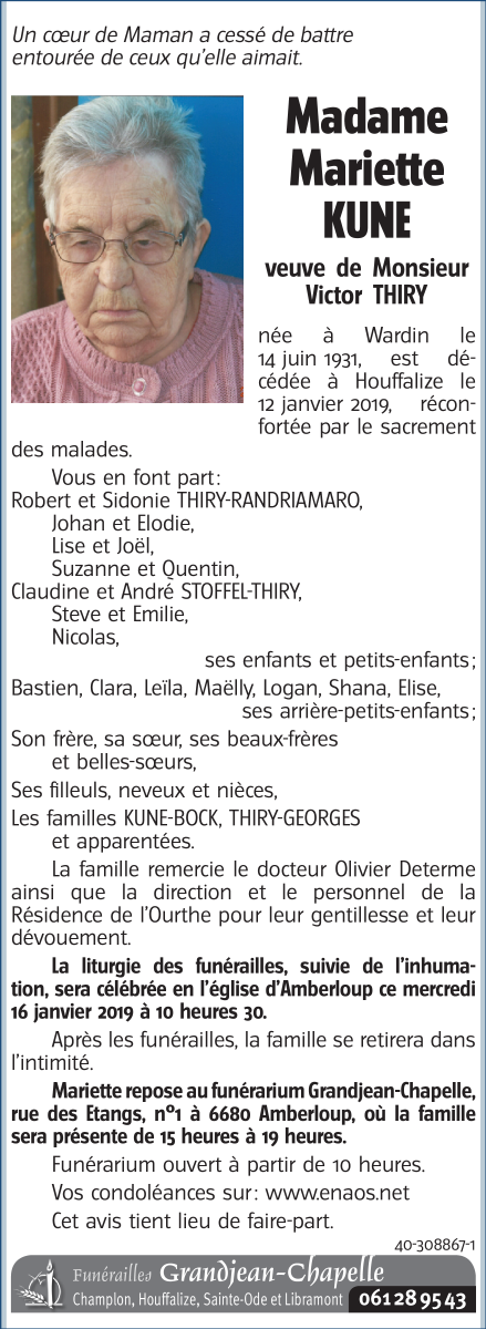 Décédée à Houffalize (6660) le samedi 12 janvier 2019 à l'âge de 87 ans