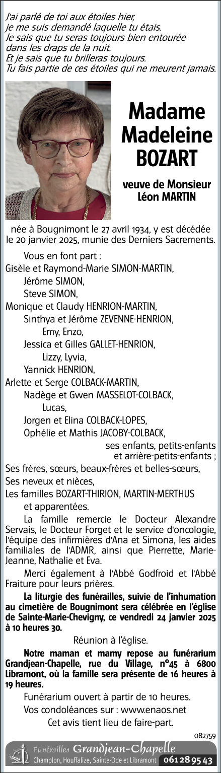 Décédée à Bougnimont (6800) le lundi 20 janvier 2025 à l'âge de 90 ans