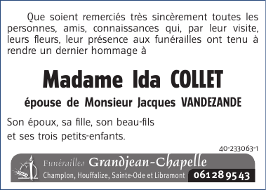 Décédée à Libramont (6800) le dimanche 17 janvier 2016 à l'âge de 82 ans
