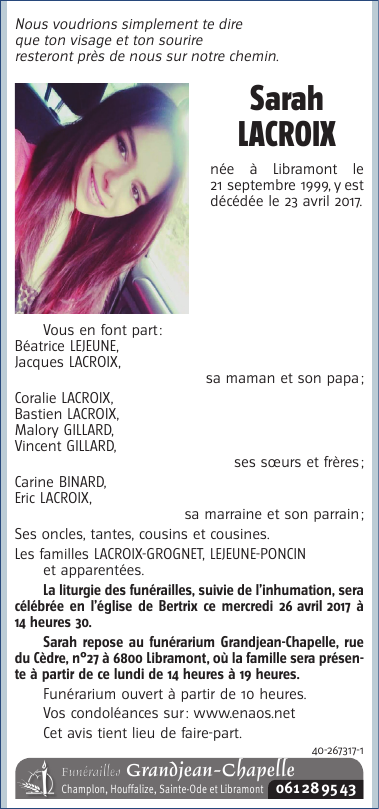 Décédée à Libramont (6800) le dimanche 23 avril 2017 à l'âge de 17 ans