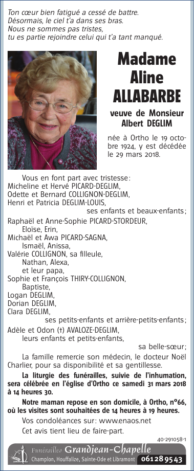 Décédée à Ortho (6983) le jeudi 29 mars 2018 à l'âge de 93 ans