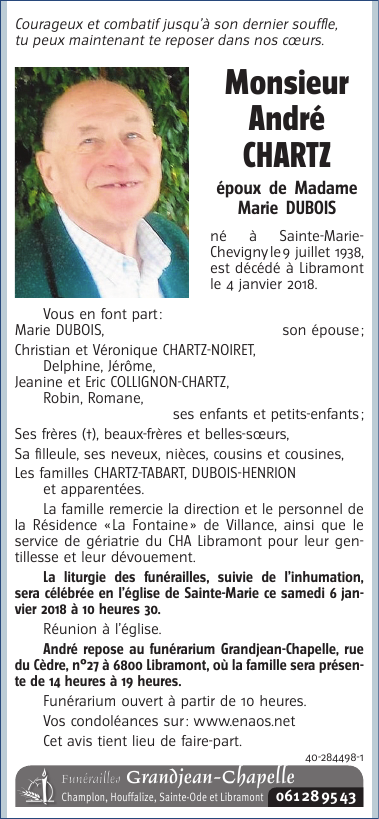 Décédé à Libramont (6800) le jeudi 4 janvier 2018 à l'âge de 79 ans