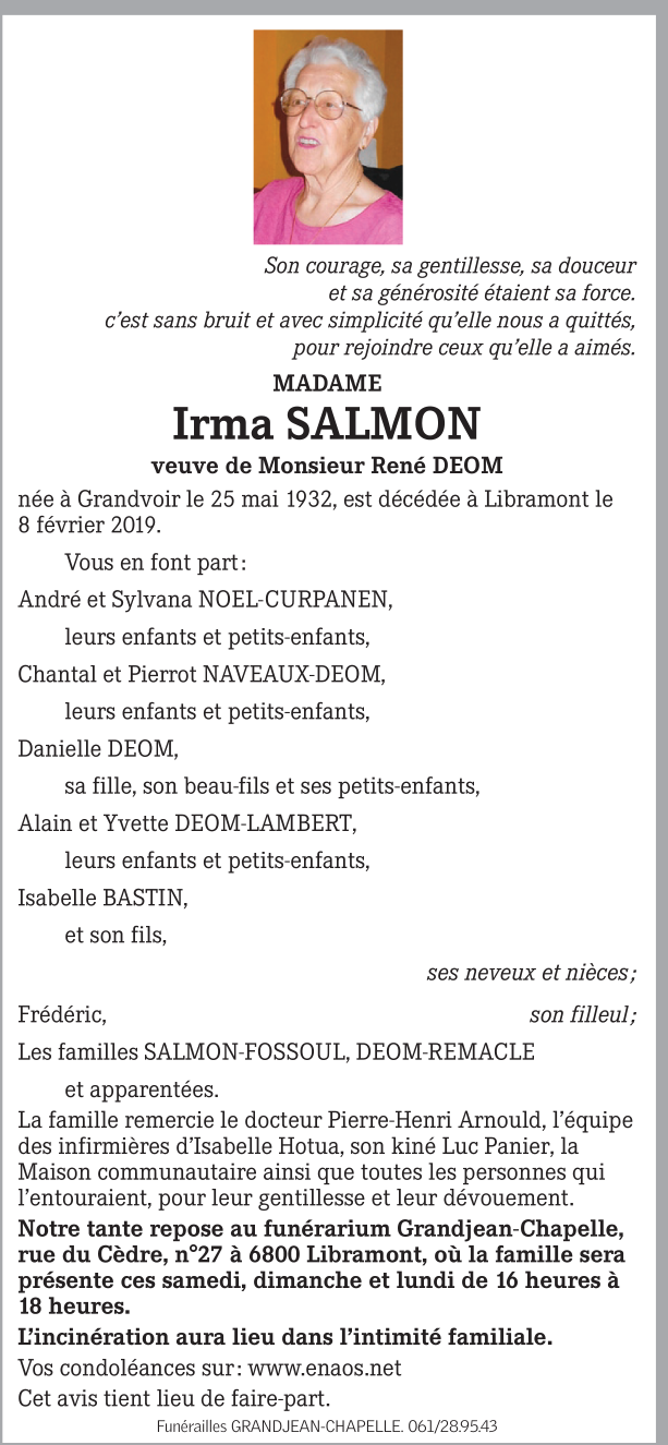 Décédée à Libramont (6800) le vendredi 8 février 2019 à l'âge de 86 ans