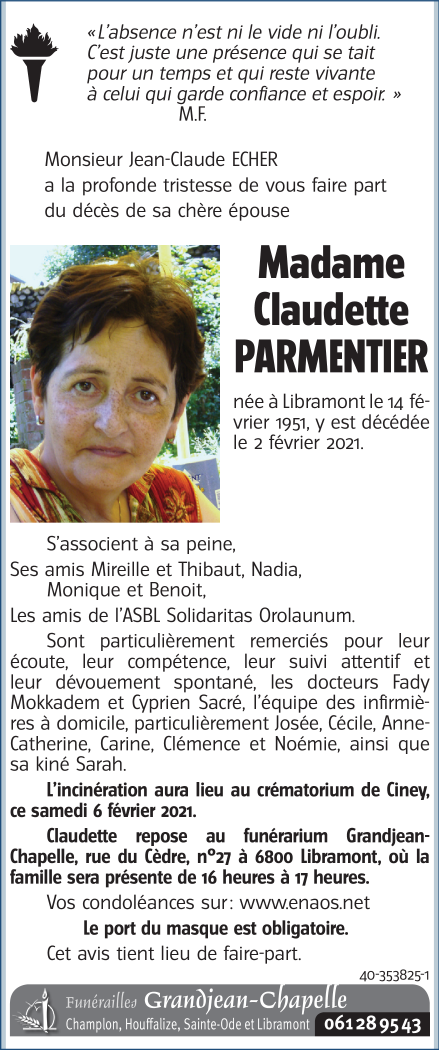 Décédée à Libramont (6800) le mardi 2 février 2021 à l'âge de 69 ans